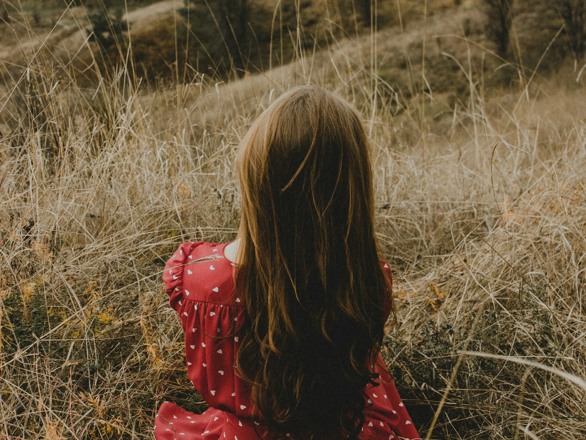 Dziewczyna w czerwonej sukience w kropki siedzi tyłem na polu, jest lato